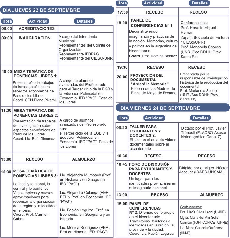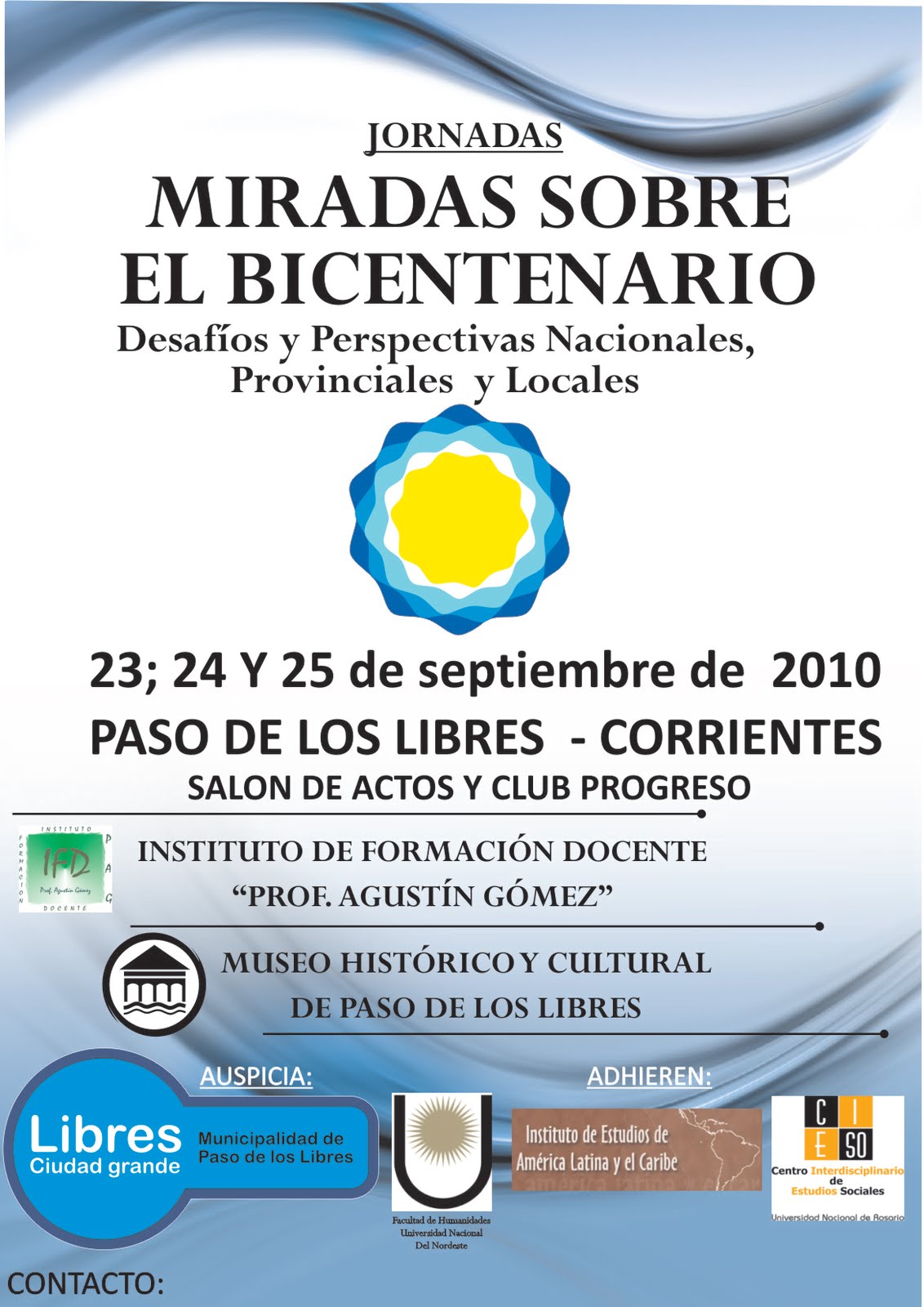 Las Jornadas “Miradas sobre el Bicentenario: Desafíos y Perspectivas Nacionales, Provinciales y Locales» se llevarán a cabo los días 23, 24 y 25 de septiembre, en la ciudad de Paso de los Libres. Las mismas están organizadas por el Instituto de Formación Docente “Prof. Agustín Gómez” y el Museo Histórico y Cultural de la ciudad y cuentan con el auspicio de la Municipalidad de Paso de Paso de Los Libres.