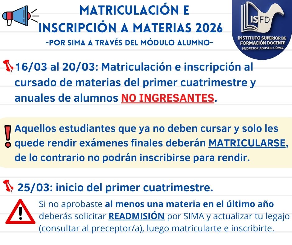 Matriculación e inscripción a materias 16 marzo, 2026 por María Virginia Denis Mansilla CARRERAS DOCENTES: estudiantes de cohorte 2021 en adelante que se inscriban por SIMA para cursar «CONDICIONAL», deberán además presentar nota al preceptor de su carrera indicando: la solicitud de cursado, materia/s y carrera a la que pertenece.